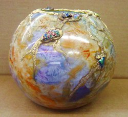 | Crystal Magic has a very strong mothball odor when you open the bottle because of the solvents. The odor disappears once the solvents evaporate completely , so the Crystal Magic can be left on a piece unfired. Just apply a coat of CM on the piece as per the basic directions, but once the crystals have formed , just leave the piece as is. Once the patterns have formed , the drying process can be hastened by using a hairdrier or leaving the piece in the sun ( but dont do this until after the patterns have formed.. The CM needs to be fluid to work ) This unfired look is most effective over a fired coat of chinapaint and is especially beautiful over fired gold, silver and/or platinum and fired metallic paint. The gold or silver coat doesnt have to be a perfect coat. Apply a coat of Liquid Bright gold, Burnish gold, Roman gold , Silver, Platinum, Metallic paint or china paint on the piece and fire to your normal temperature. ( cone 018/1320F/717 C to cone 015/1480F/800C )Burnish the gold if you are using Roman gold. Then apply CM according to basic directions but dont apply a luster. Just let the patterns form and then leave the CM to dry completely. As a matter of fact, unfired CM is a great fix for gold that has come out of the kiln with spots, dull areas, scratches etc. The CM coat will cover the imperfections. The CM coating unfired will stand up to moderate handling and can even be cleaned from time to time with a damp cloth but it can be scratched off with rough handling. If this happens, just re-apply more CM. |