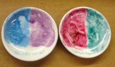 Crystal Magic is a product that dries to creates a Jack Frost pattern. It can be used to get lots of interesting effects and can either be fired or left unfired. The bowl on the left shows the basic Crystal Magic effect with 3 colors of luster...violet, turquoise and rosey red. Precautions: