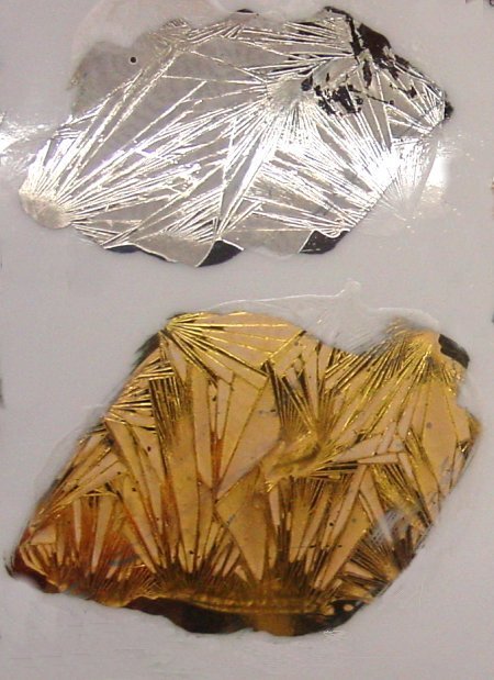 | The effect on the left is CM over metallic gold paint . The metallic gold is available on my Products page. I simply mix it with any medium and paint it on the glaze. I sort of flow and coax it on . The metallic particle take a little gentle brushing to get them to cover completely... Then I fire to cone 015 ( 1480 F/800C ) . Once it is fired, it will have a slightly rough texture. I then put a coat of CM over it as per general instructions. YOu can also apply a coat of dark luster over the dried CM, wipe off the excess luster and fire at cone 017. That is the effect on the right. |