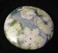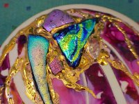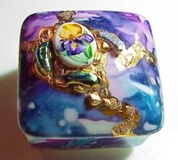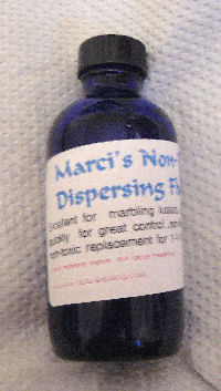 The box above is violet and turquoise luster with dispersing fluid dripped over to marble the colors. Dispersing Fluid is the best product available for marbling and dispersing lusters. It cuts through lusters quickly but its most important feature is that , unlike lavender oil, alcohol or other solvents, dispersing fluid evaporates very quickly which stops the marbling action and gives you more control over it. |