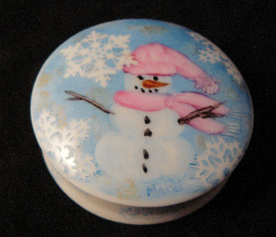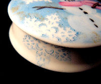 Directions: Peel off the laser cut resist. It is already pre-glued. Apply to the china and press down well. Then pounce chinapaint over it with a sponge. You can also use lusters over it or paint right over it ( but you have to be careful not to get a build- up of paint on the edges of teh sticker.) Leave in place and fire . The sticker will burn off in the kiln . ( I have other laser cuts available a little further in the catalog that are vinyl... Those can not be fired and must be peeled off before firing ) The stickers burn up to a heavy ash that will not fly around the kiln, but gravity will affect it ..so if the stickers are on a surface where the ash will fall,( like the side of a box) , make sure that the ash will fall on the kiln shelf and not land on another piece or another part of the same piece.. **************** The snowman box : I applied the snowflake stickers, then pounced the entire box lid with blue china paint...I then used a Q-tip tp wipe out the snowman , making little snowballs... I wiped out the hat and scarf with a wipe out tool, then painted in the color and the detail . Leave on the stickers and fire. On the bottom of the box, I pounced blue paint over the half snowflakes ( I overlapped some snowflakes over the top edge onto the sides) I wiped the paint off of the snowflakes with a paper towel...but enough paint catches in the ridges of the stickers that it leaves a penwork look .