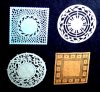 These laser cuts enable you to do a "wiped out" look on china without the work. You simply peel the laser cuts off their backing paper, stick them onto the china ( they are pre-glued) and then pounced over them with china paint and a sponge. You can also paint over them or do lusters.The laser cuts are left on the piece and fired. They will burn up in the kiln , leaving the design resisted on the china. They can be used on glass as well. I have additional laser cut stickers ( scroll down or click here ) that are designed to be peeled off before firing and are reusable... but the ones in this section are NOT reusable. Some of these laser cuts come in colors or metallics. Note that the effect , however, is that the design will be the white of the china with the background being the color of paint you chose. It will NOT fire the color of the sticker.( The color is incidental )